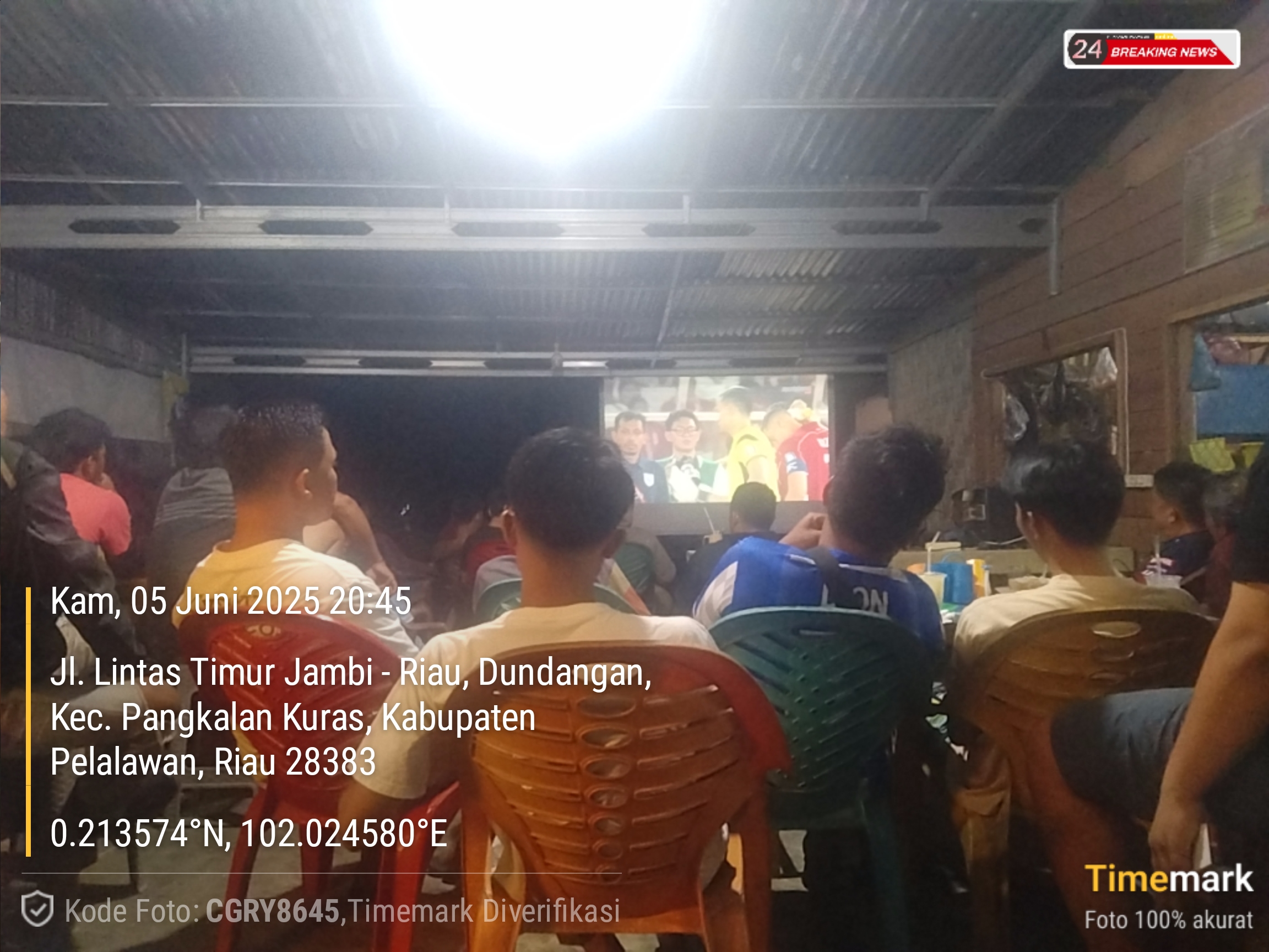 Berdasarkan data lokasi dan waktu dari dokumentasi lapangan, kegiatan ini berlangsung di koordinat 0.213574°N, 102.024580°E, menandakan keterlibatan aktif masyarakat di pelosok daerah dalam mendukung perjuangan Timnas Indonesia.