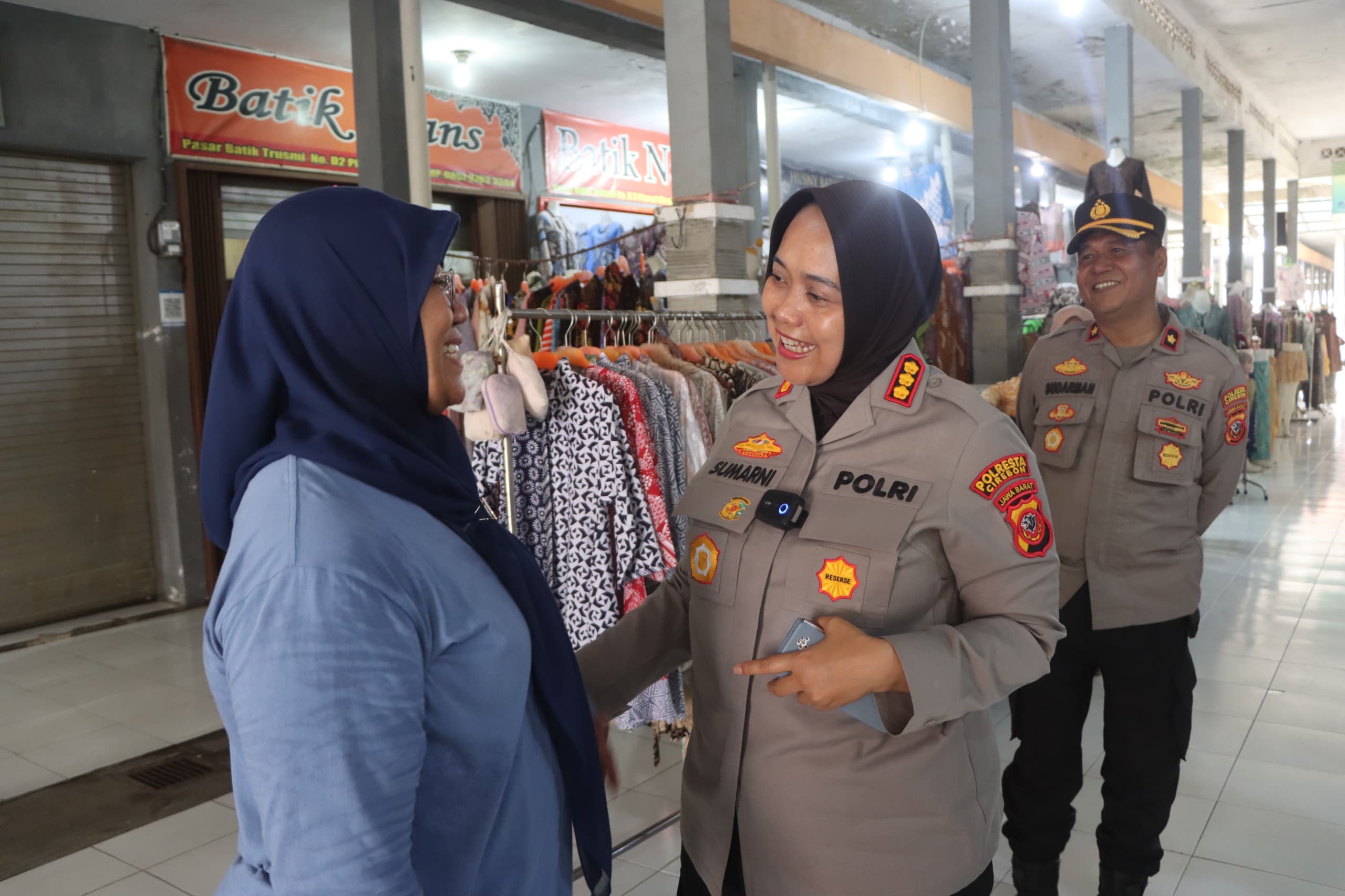 Selanjutnya para petugas menyambangi para pelaku UMKM Batik di Pasar Batik Trusmi yang berada di Ds. Weru Lor Kec. Weru Kab. Cirebon sebagai bentuk dukungan dan pemberdayaan UMKM serta Penguatan Keamanan Ketertiban.