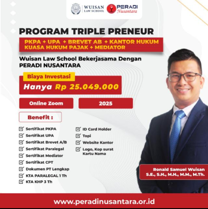 Jakarta, 19 Agustus 2025 | khabarpetang.my.id — Dunia pendidikan hukum di Indonesia kembali menghadirkan gebrakan baru. Wuisan Law School bersama Perhimpunan Advokat Indonesia (PERADI) Nusantara resmi meluncurkan Program Triple Preneur, sebuah paket pendidikan hukum terpadu yang menggabungkan pendidikan profesi, sertifikasi, hingga fasilitas usaha mandiri bagi para calon praktisi hukum.