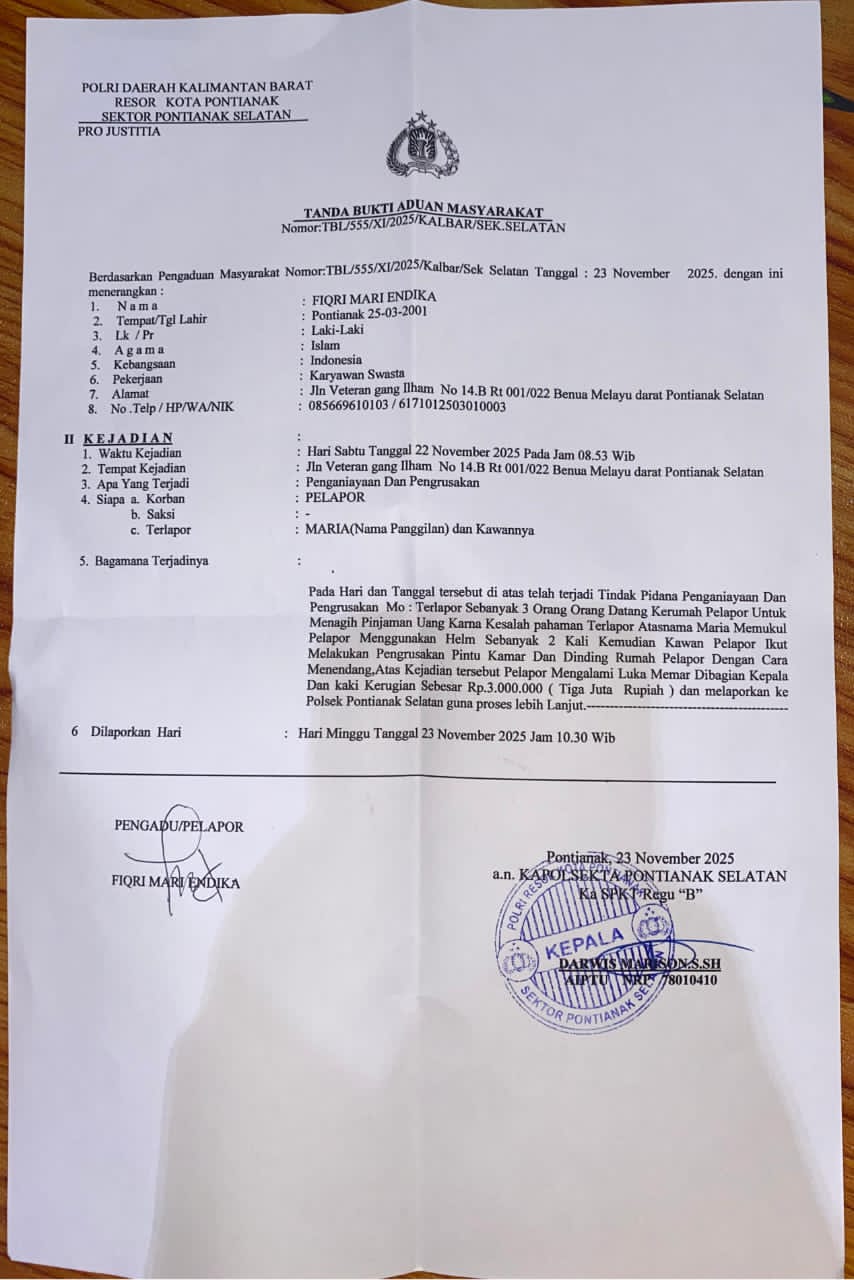 Pontianak, 22 November 2025 — Insiden kekerasan terjadi di Jalan Veteran, Gang Ilham No.14 B, RT 001/022, Kelurahan Benua Melayu Darat, Kecamatan Pontianak Selatan, ketika FiQri Mari Endik menjadi korban penganiayaan dan perusakan rumah oleh tiga penagih utang pada Sabtu pagi.