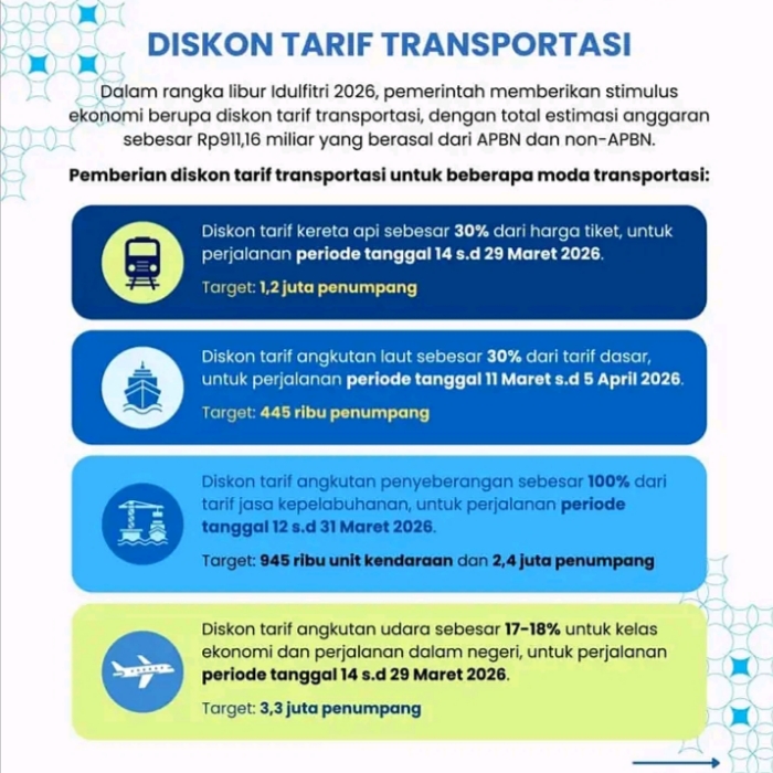 Kebijakan diskon transportasi diharapkan mampu meringankan biaya perjalanan masyarakat serta melayani jutaan penumpang selama periode mudik Lebaran 2026. Pemerintah menilai langkah ini penting untuk menjaga kelancaran arus mobilitas sekaligus mendorong perputaran ekonomi di berbagai daerah.