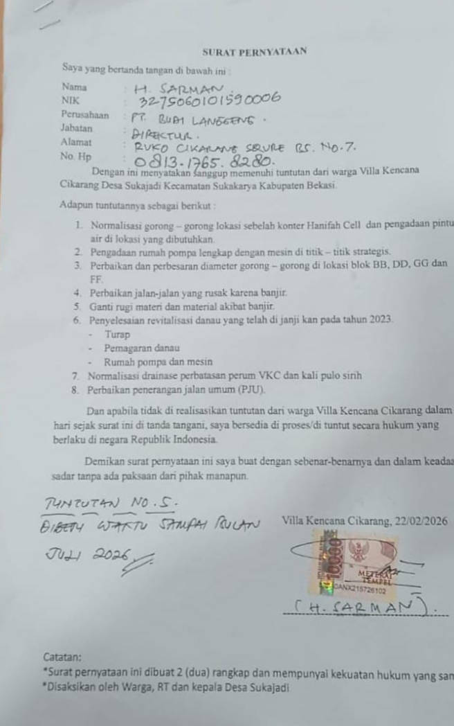 Menanggapi tuntutan tersebut, H. Sarman menyatakan pihak developer akan menindaklanjuti aspirasi warga secara bertahap. Namun, untuk tuntutan poin nomor lima terkait ganti rugi materi dan material akibat banjir, pihaknya meminta waktu hingga Juli 2026.