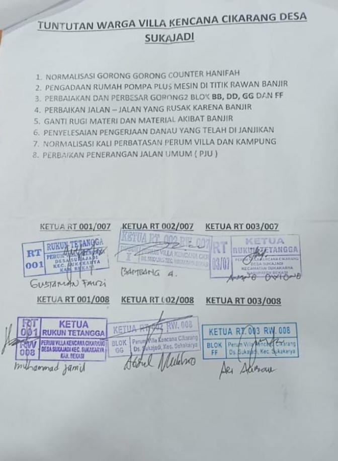 Kendatipun Warga berharap seluruh tuntutan dapat direalisasikan sesuai komitmen yang disepakati dalam pertemuan tersebut, guna mencegah banjir kembali terulang dan memberikan rasa aman serta kepastian bagi masyarakat Perum Villa Kencana Cikarang.