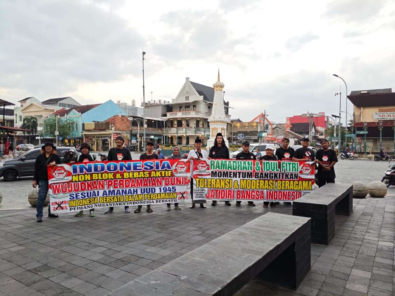 Khabarpetang.my.id,Yogyakarta , 9 Maret 2025 -Ormas kebhinekaan lintas Agama budaya dan tradisi Penjuang Nusantara Indonesia Bersatu (PNIB) menggelar aksi bisu berbagi takjil di Monumen Tugu Yogyakarta Selasa (9/3/2026). Puluhan peserta membentangkan spanduk bertema seruan perdamaian, persaudaraan, moderasi beragama serta ajakan kembali kepada jatidiri bangsa.