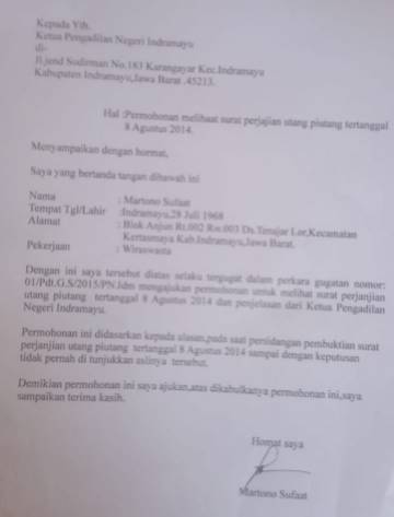 ‎Martono mengungkapkan bahwa dalam perkara perdata Nomor 01/Pdt.G.S/2015/PN.Idm, penggugat mengajukan sebuah surat perjanjian utang piutang tertanggal 8 Agustus 2014 yang mencantumkan dirinya sebagai pihak yang mengakui memiliki utang.