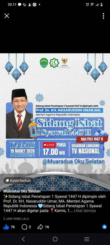 Sementara itu, Muhammadiyah telah lebih dahulu menetapkan 1 Syawal 1447 Hijriah jatuh pada Jumat, 20 Maret 2026. Penetapan tersebut didasarkan pada metode hisab hakiki wujudul hilal yang digunakan organisasi tersebut secara konsisten.